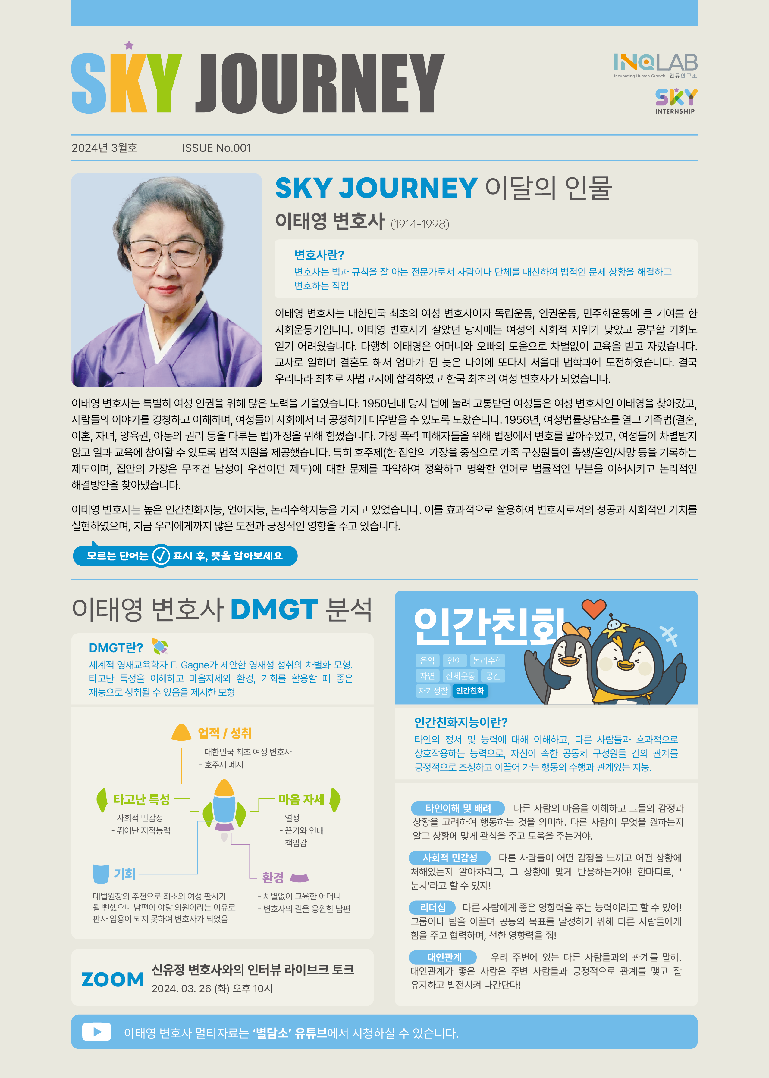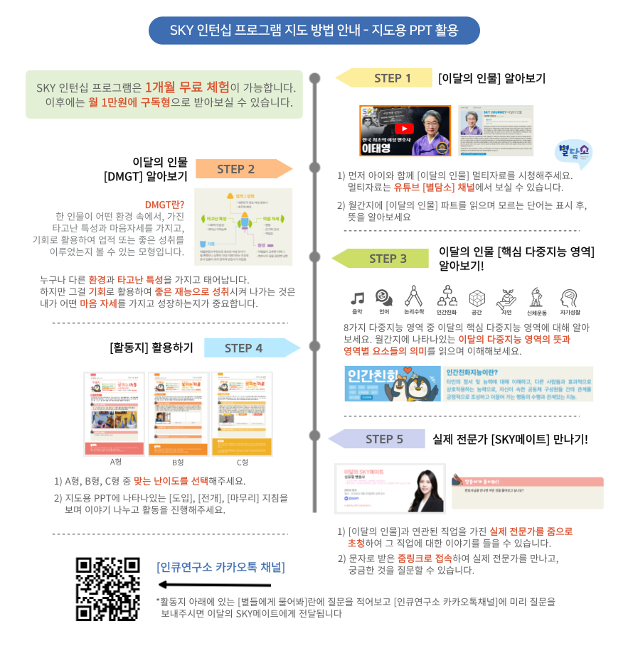 매 달 제공되는 [SKY JOURNEY] 월간지와 연령에 맞는 맞춤형 활동지를 통해 직업과 다중지능에 대해 이해합니다.