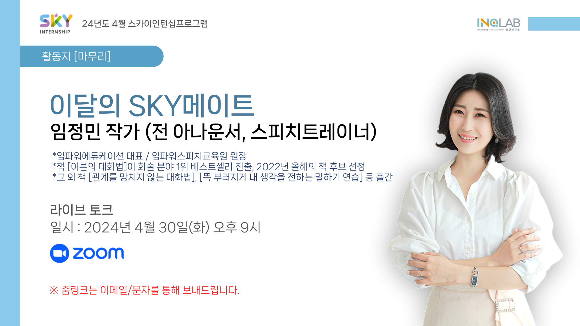 신청서를 작성해주시면, 이달의 SKY 인턴십 프로그램에 참여하실 수 있도록 교육 자료와 줌링크를 이메일로 전송드리겠습니다.